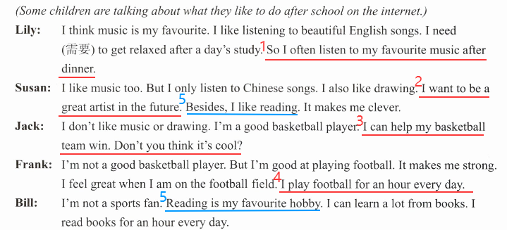- 解析:文中莉莉提到“So I often listen to my favourite music after dinner.”(所以我经常在晚饭后听我最喜欢的音乐),所以答案是“After dinner.”。