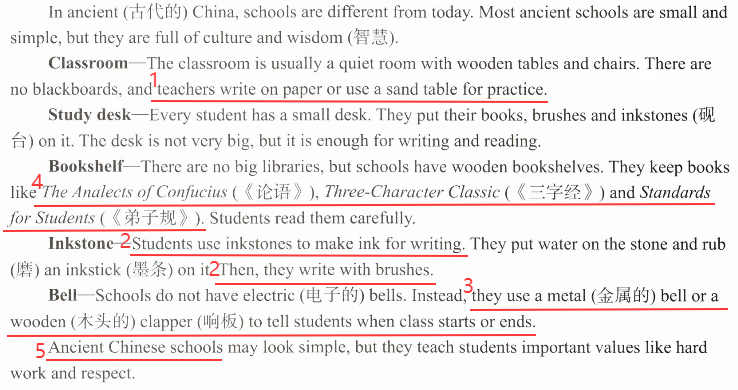 - 解析:文章主要介绍的是中国古代学校的相关情况,所以最佳标题是“Ancient schools in China”,选D。