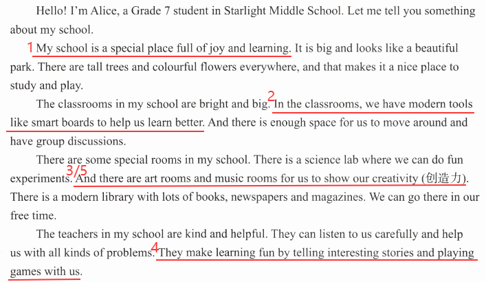 大家好!我是艾丽斯,星光中学七年级的一名学生。让我来跟你们讲讲我的学校。