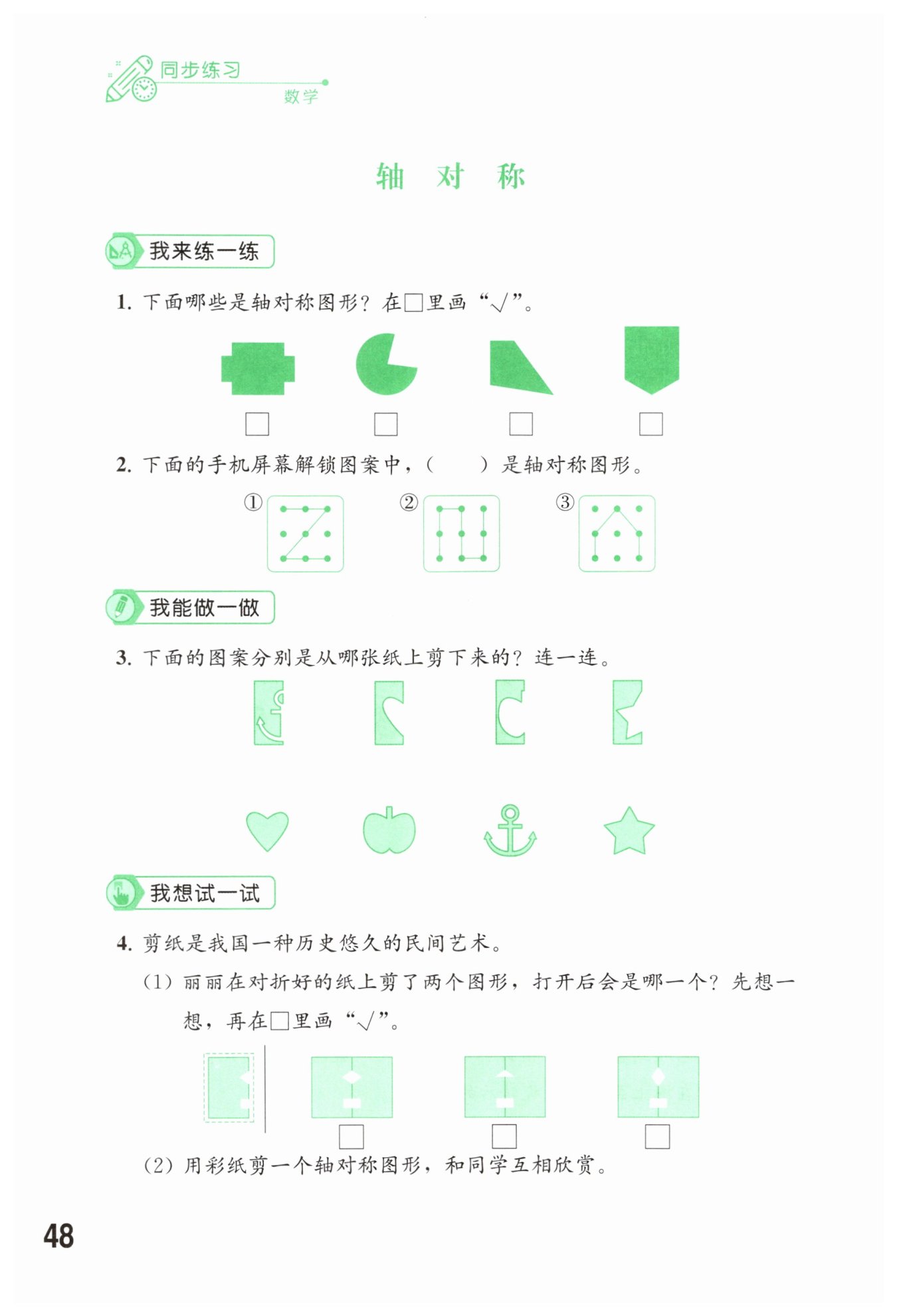 根据轴对称图形定义,沿一条直线对折后两边完全重合的图形是轴对称图形。①图案对折后两边不重合;②图案对折后两边不重合;③图案沿中间竖线对折后两边完全重合。
