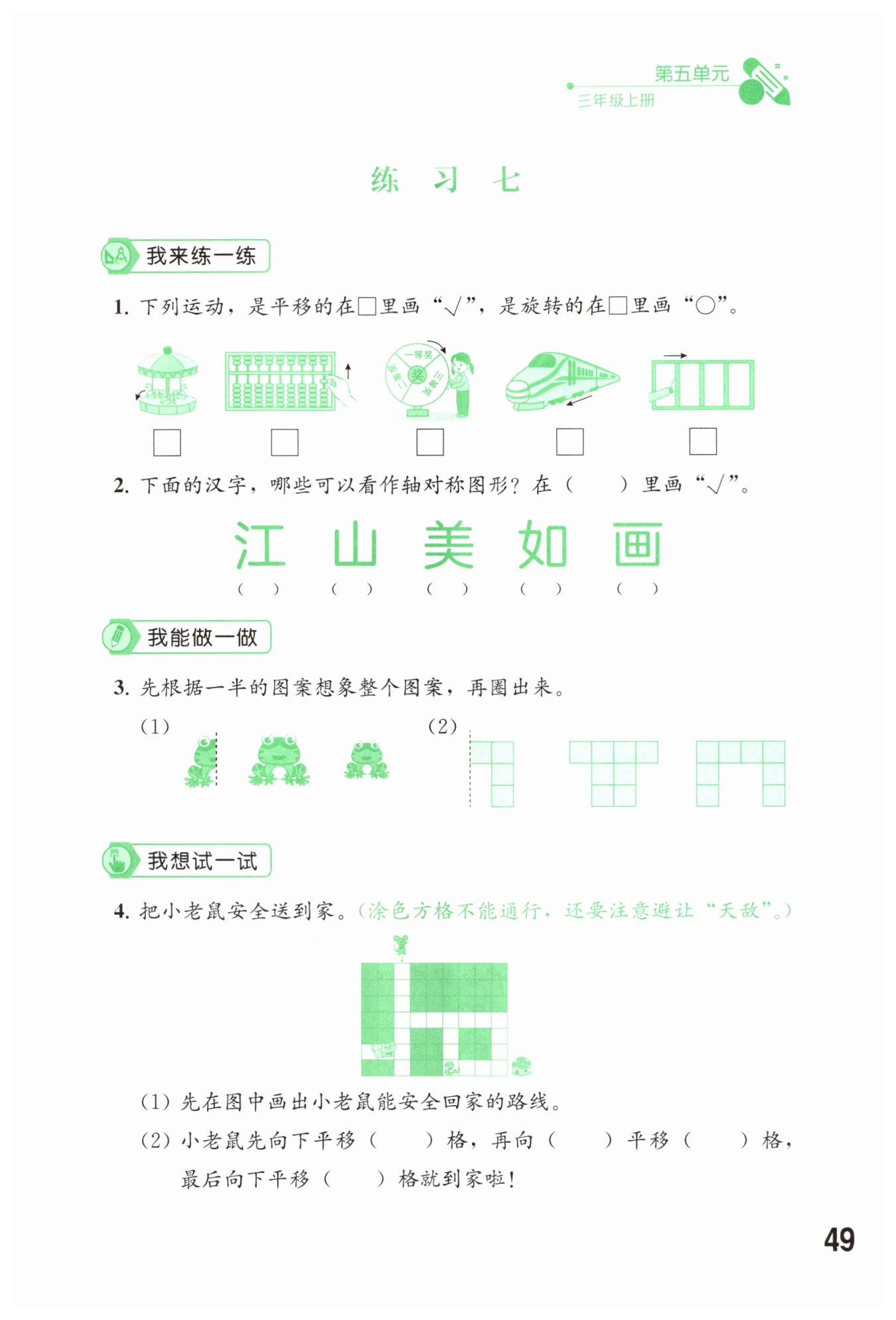 (1)观察左边一半青蛙图案,头部、眼睛、前肢、后肢的形状和位置,右边应与之对称,第二个图案完整且对称;