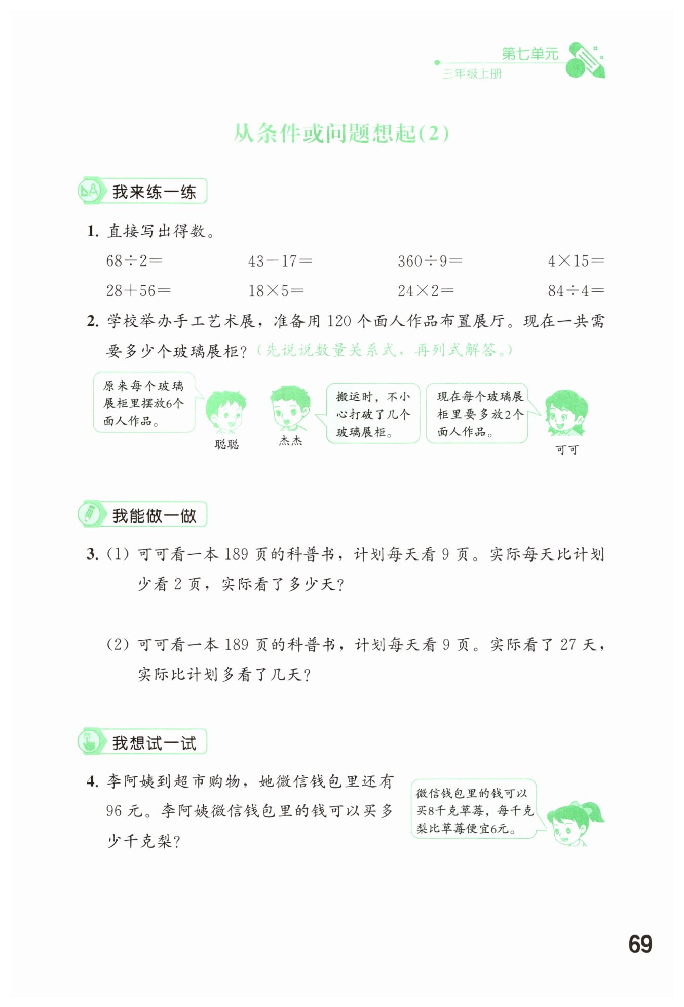 1. 计算每千克草莓的价格:已知微信钱包里有96元,可以买8千克草莓,根据“单价 = 总价÷数量”,可得每千克草莓的价格为$96÷8 = 12$(元)。