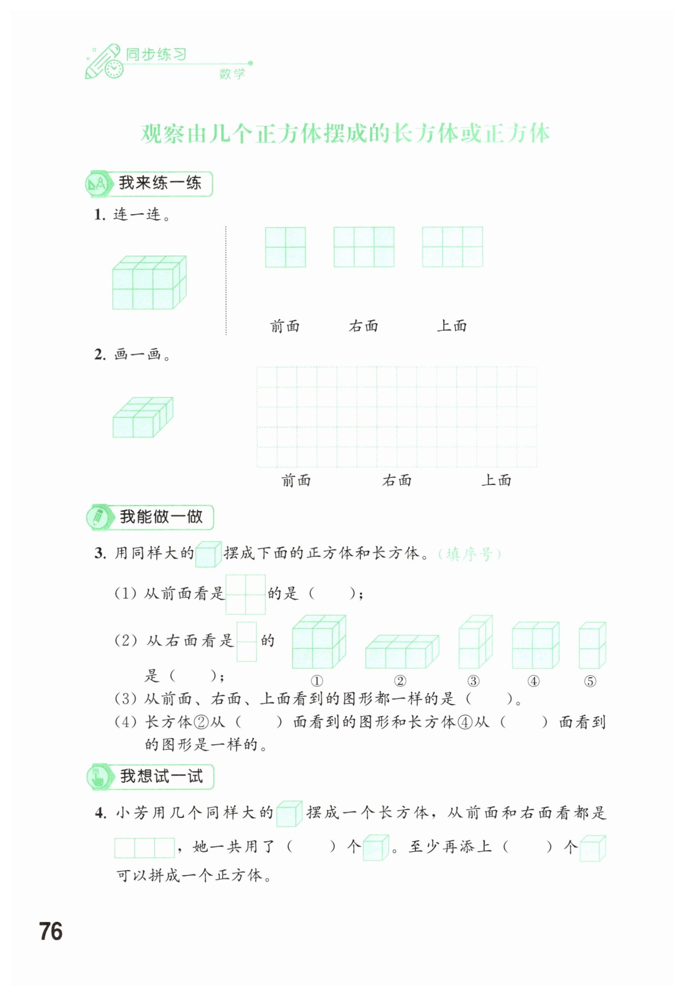 从前面看是3个正方形,说明长方体长为3,高为1;从右面看是3个正方形,说明长方体宽为3,高为1。长方体由3×3×1=9个正方体组成。拼成正方体棱长至少为3,体积3×3×3=27,需添27-9=18个。