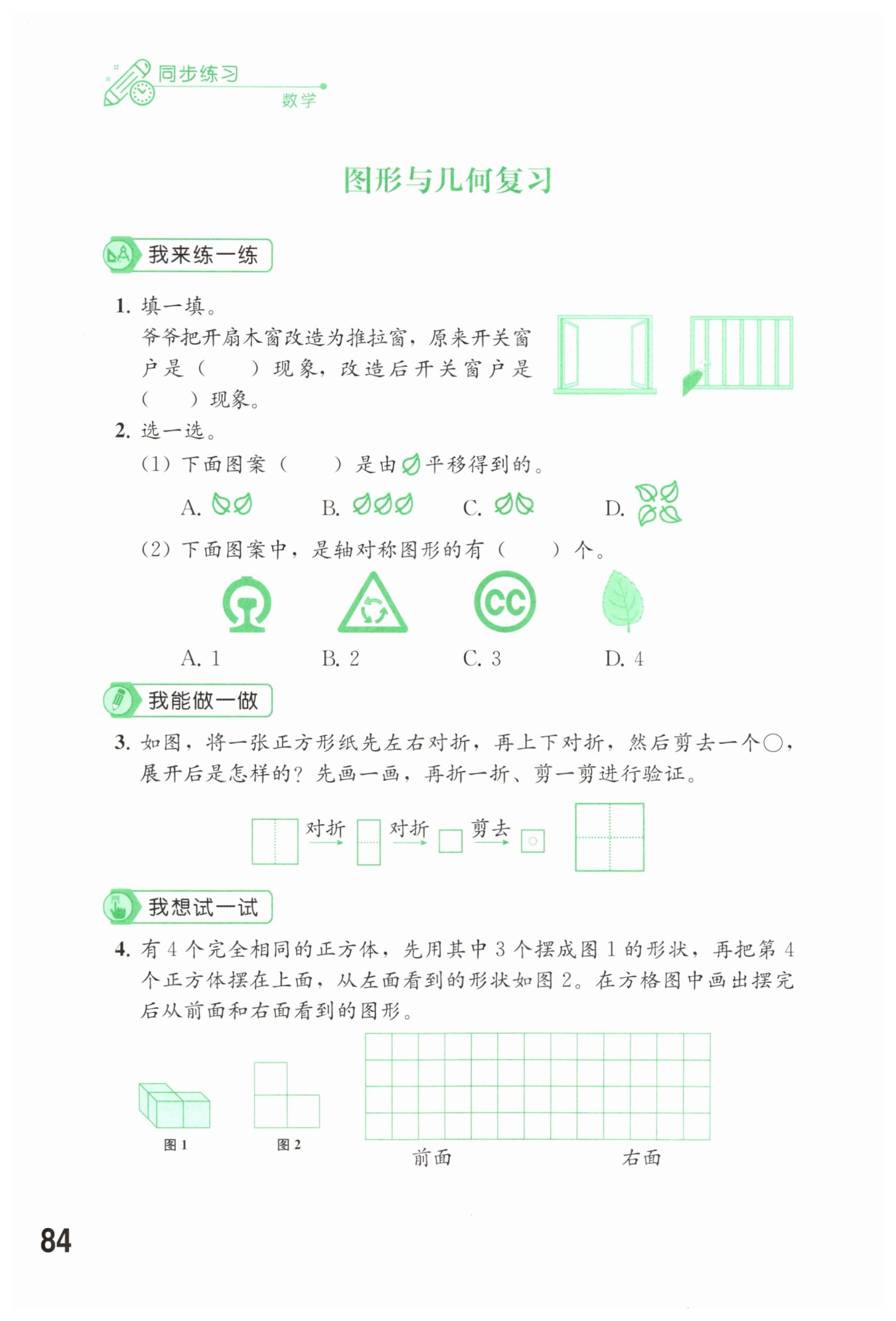 展开后图形:在原正方形纸中,两条互相垂直的虚线(水平中线和竖直中线)将其分成四个全等小正方形,每个小正方形中心各有一个圆形镂空。