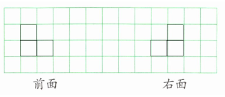 (在“前面”方格图中,从下往上第一行画3个相连的正方形,第二行在最左侧画1个正方形;在“右面”方格图中,从下往上第一行画2个相连的正方形,第二行在最右侧画1个正方形。)