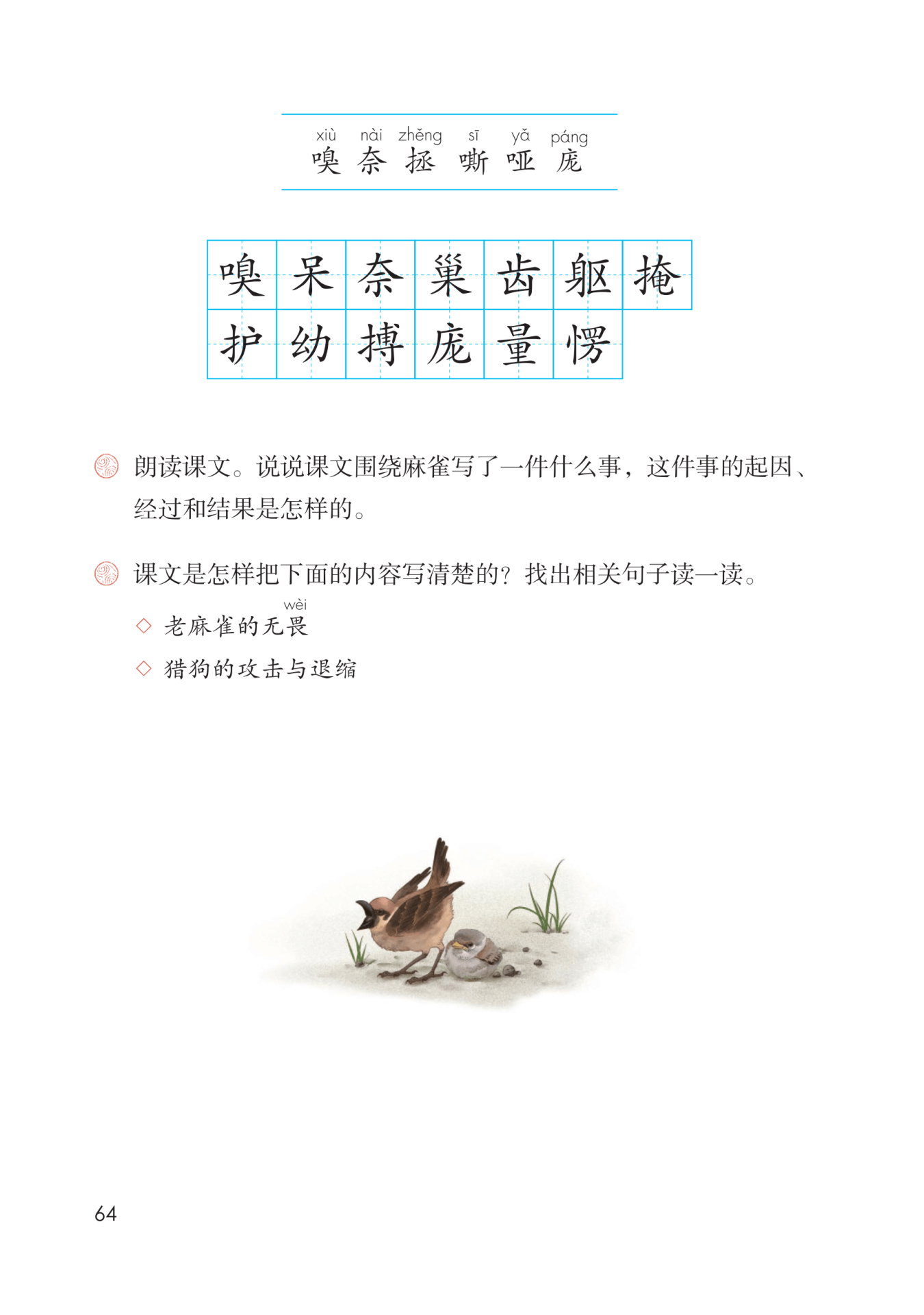 仔细阅读课文,找出课文中描写这两个内容的句子读一读,从对猎狗和老麻雀的神态、动作的描写中,体会课文是怎样把这两个内容写清楚的。
