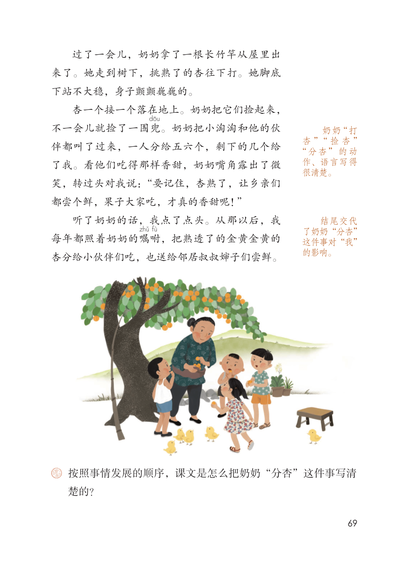 课文是按照事情的起因、经过、结果来写奶奶“分杏”这件事的。起因是邻居家的小淘淘嘴馋摘杏,不小心从树上摔下来。经过是奶奶扶起小淘淘给他揉腿看他伤着没有,接着奶奶拿长竹竿挑熟了的杏往下打。结果是奶奶把小淘淘和他的小伙伴叫过来分给他们杏儿。