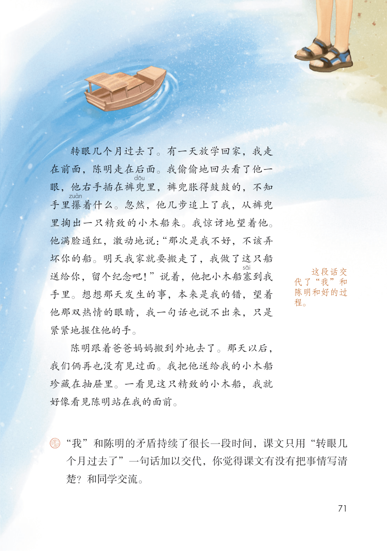 课文将事情写清楚了。课文围绕小木船,将“我”与陈明从闹矛盾到和好这件事情的起因、经过、结果都交代清楚了。其中,课文重点写了两人的友谊破裂及最终和好,因为这两部分最能反映文章主旨,是事情发展过程中的重要内容。而中间持续数月的矛盾与主旨关系不大,所以用一句话简略交代即可。
