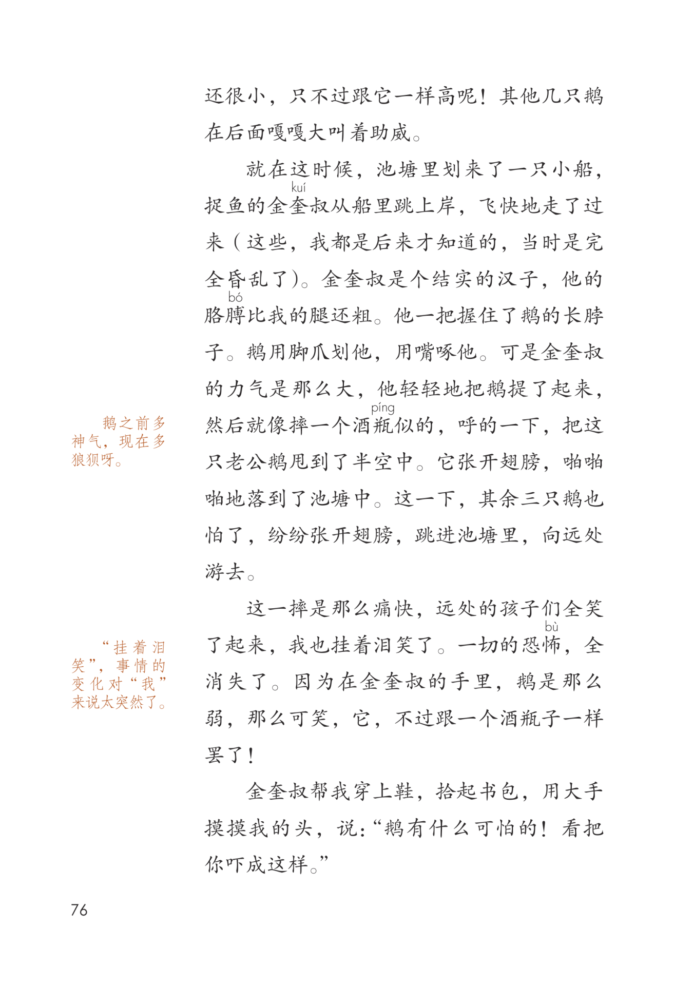 很凶猛的鹅,在金奎叔面前竟害怕起来,威风劲儿一点也不见了。