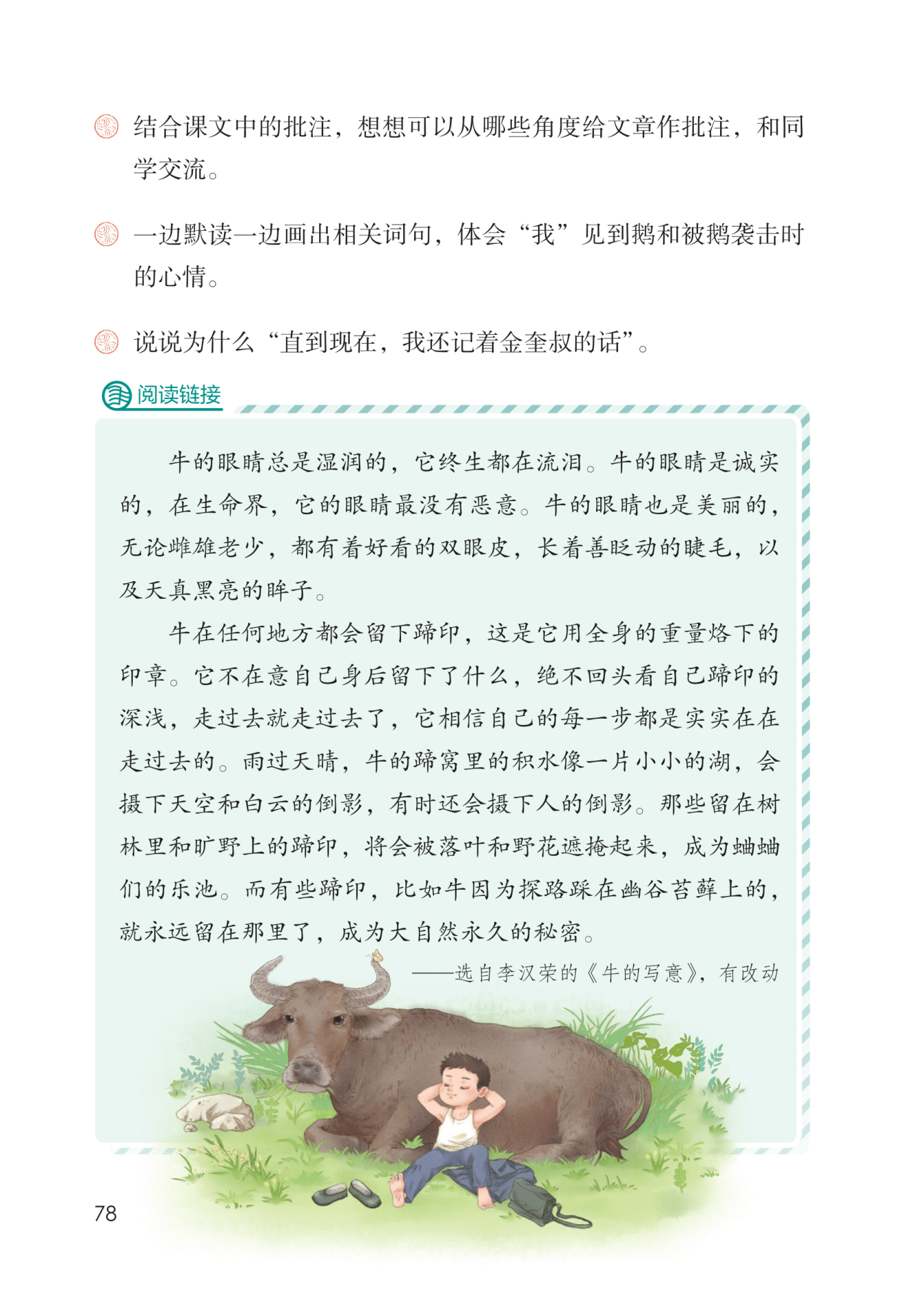 金奎叔的话使“我”懂得:不要在意别人怎么看待你;别人无理欺负你时不要怕,要敢于制止他;要看到自己的力量,不要盲目地怕人、怕事、怕物;不要轻易听信别人的胡言乱语;不要因为自己强就欺负别人……这些道理,对“我”都具有深远的教育意义,所以,“直到现在,我还记着金奎叔的话”。