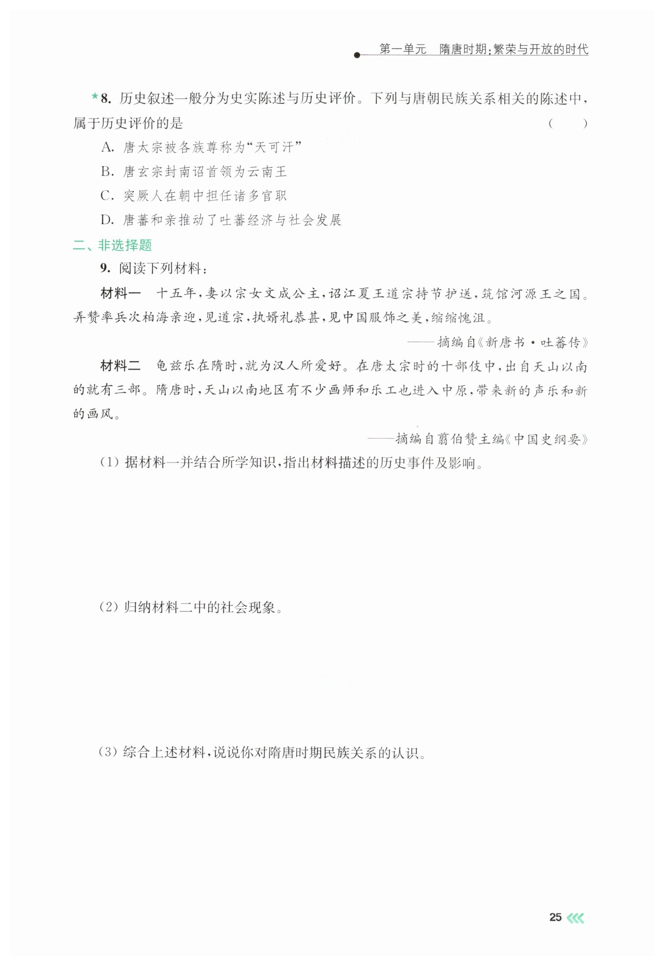 首先要明确史实陈述与历史评价的核心区别:史实陈述是对历史事件、人物等客观事实的记录,是已经发生的具体史实;历史评价是对历史事件、人物的作用、影响、意义等进行的主观判断与分析。解题时,需逐一分析选项,先回忆唐朝民族关系的相关史实,再结合概念区分:A、B、C选项都是对唐朝民族关系中具体事件的客观记录,而D选项是对唐蕃和亲这一事件的影响进行的评价,符合历史评价的范畴。