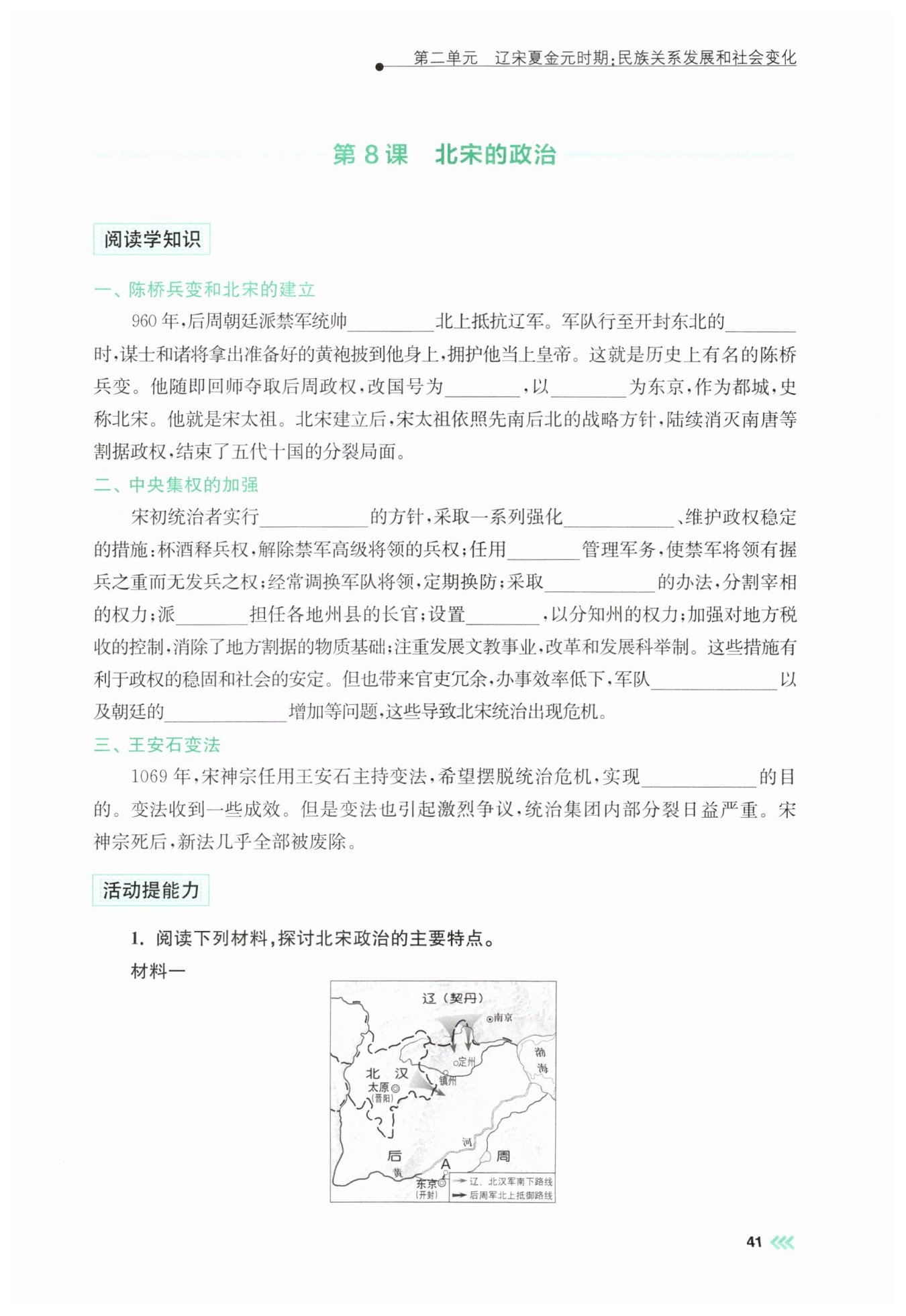 本题结合地图材料与文字材料,考查北宋建立及政治特点的相关史实,要求学生能结合材料联系所学知识进行归纳总结,培养史料实证与历史解释的核心素养。