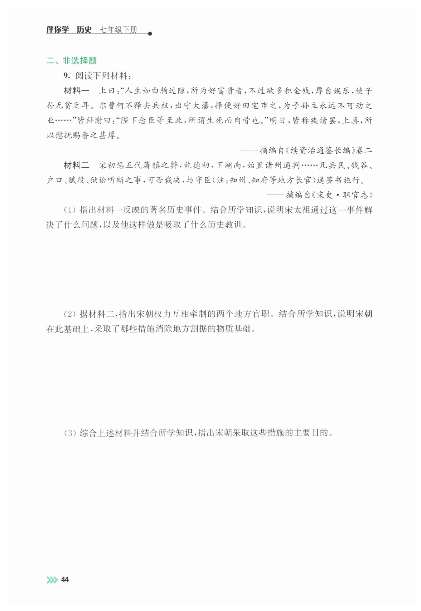 2. 第(2)问:从材料二中“与守臣(知州、知府等地方长官)通签书施行”“始置诸州通判”,能直接找出互相牵制的两个地方官职是知州和通判。回忆所学知识,宋朝消除地方割据物质基础的措施围绕财政展开,即加强对地方税收的控制,取消节度使收税的权力,设置转运使将地方财赋收归中央。
