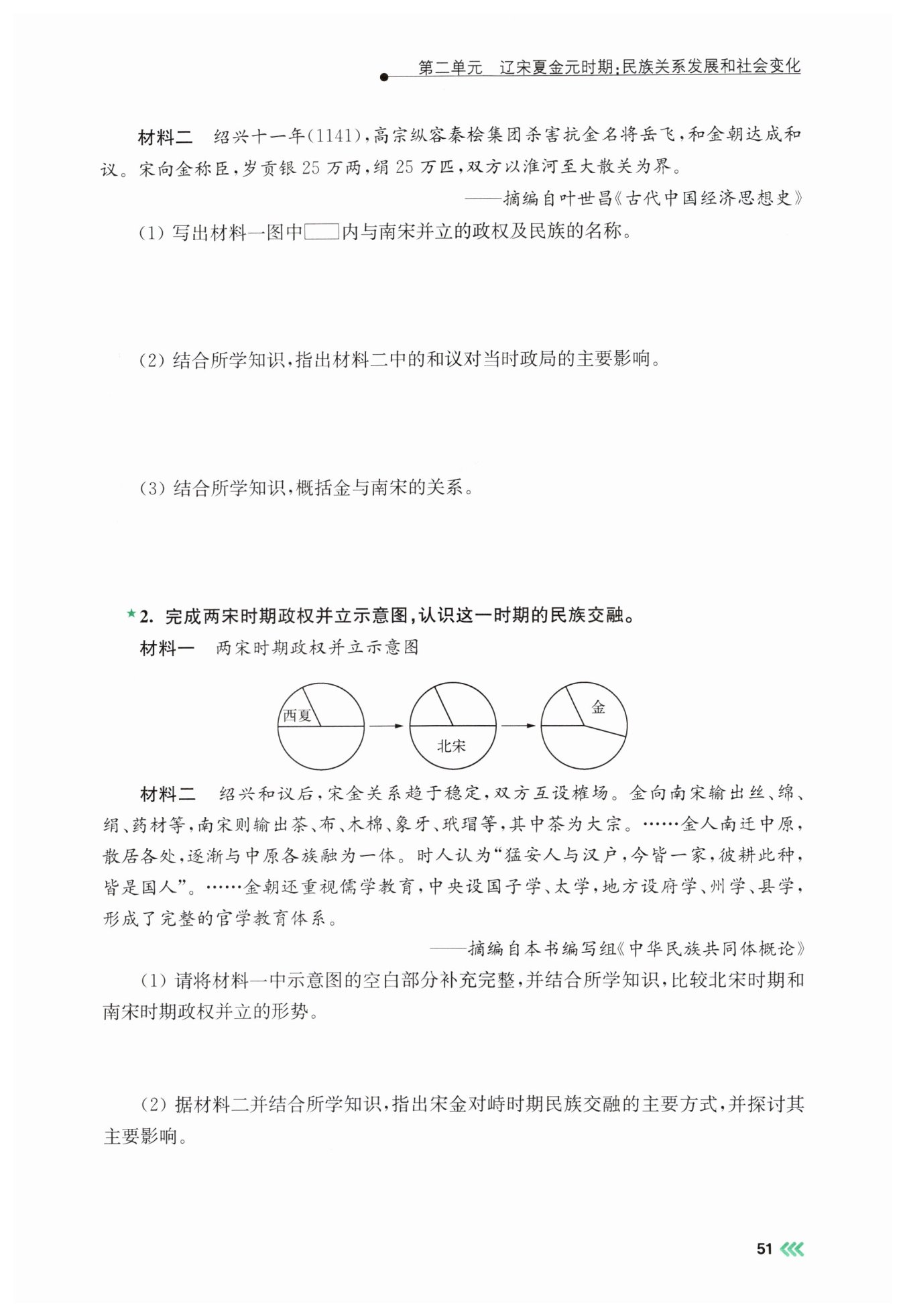 第(2)问:从材料二中提取关键信息,“互设榷场”对应经济交流,“金人南迁中原”对应人口迁徙,“重视儒学教育”对应文化学习,再结合所学补充通婚这一方式;分析影响时,从民族关系、文化发展、国家发展三个角度思考,结合材料中民族融合的表述,总结出对民族交融、文化交流和统一多民族国家的作用。