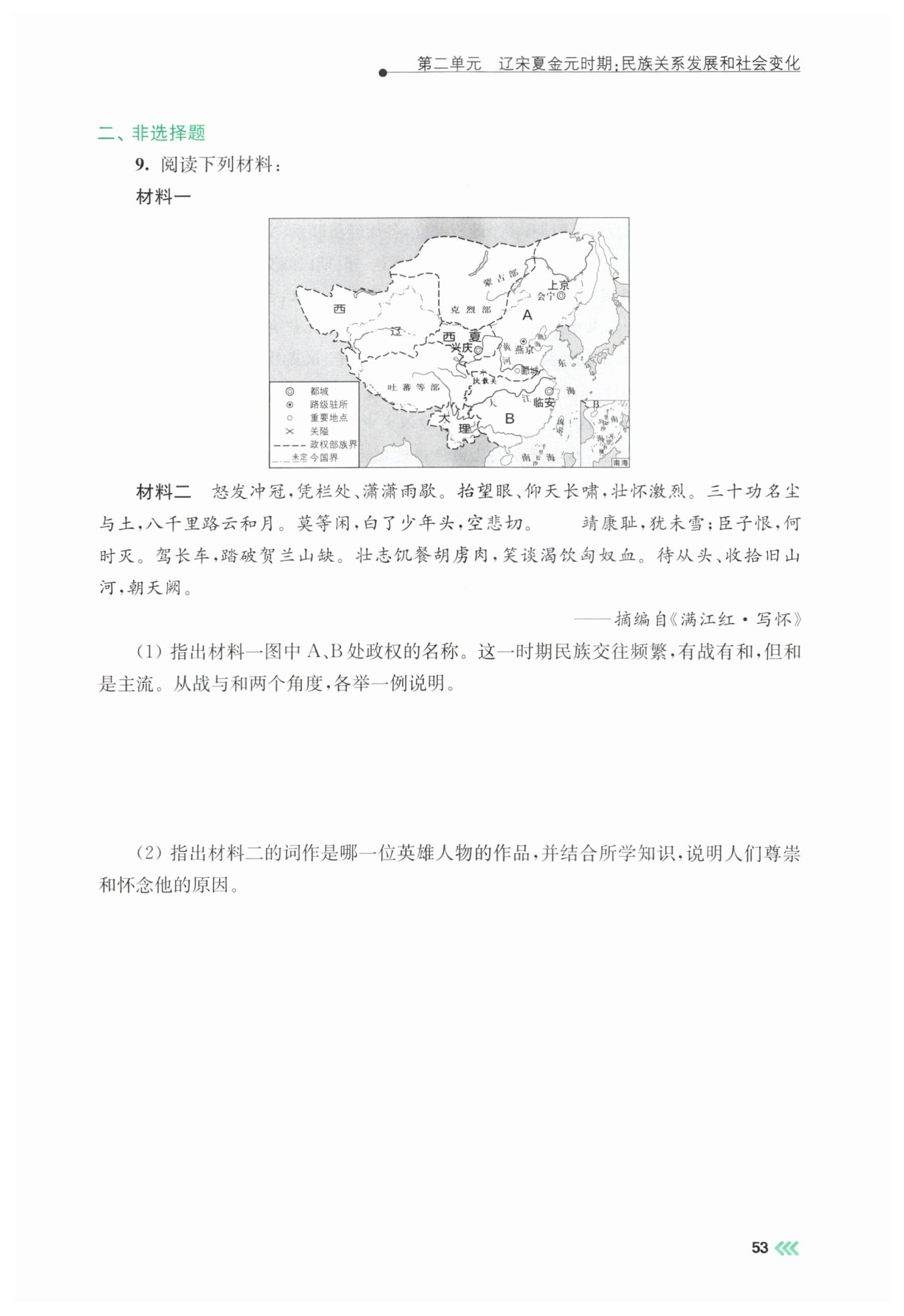 本题结合地图与诗词材料,考查两宋时期的民族政权格局与抗金相关史实,既需要学生准确掌握基础史实,也需要学生结合材料信息分析历史人物的历史价值,注重对知识运用能力的考查。