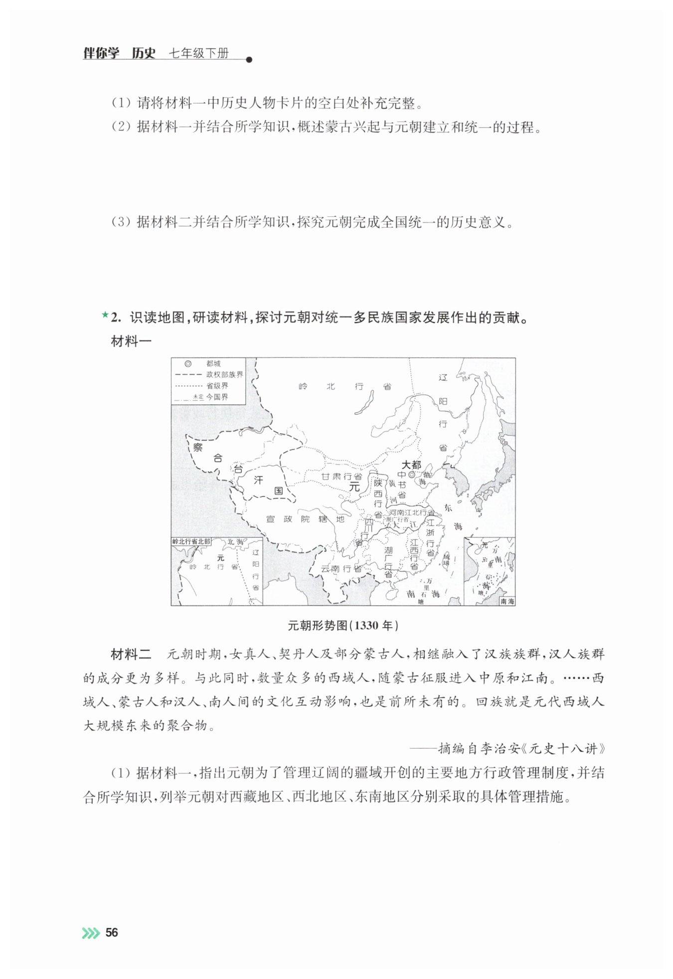 (2)①特点:从材料二中“少数民族融入汉族”“新民族回族形成”的内容,可概括出元朝民族关系的特点是民族融合程度加深,形成新的民族。