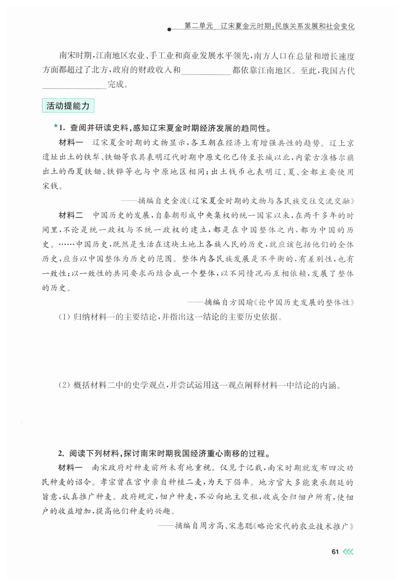 对于第(1)问,解题时先抓取材料一的核心观点句,材料开篇直接点明“各王朝在经济上有增强共性的趋势”,这就是结论;再从材料中寻找支撑结论的具体史实,即辽、西夏出土的农具与中原地区相同,辽、夏、金主要使用宋钱这些文物证据。