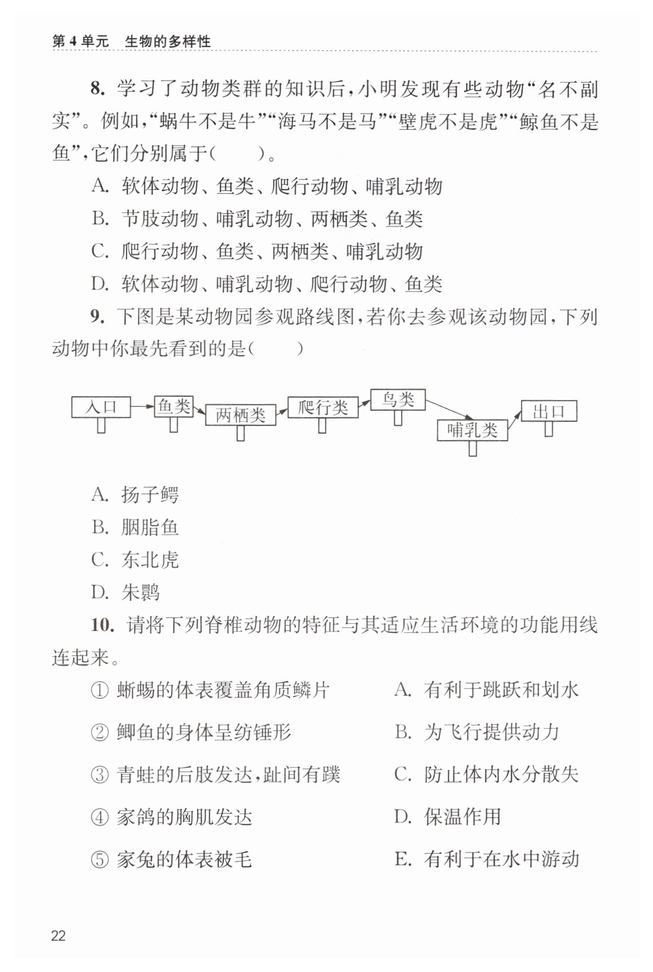 本题考查各类脊椎动物的形态结构与生活环境、功能的适应性联系,需掌握不同脊椎动物的核心特征,树立结构与功能相统一的生物学观念。