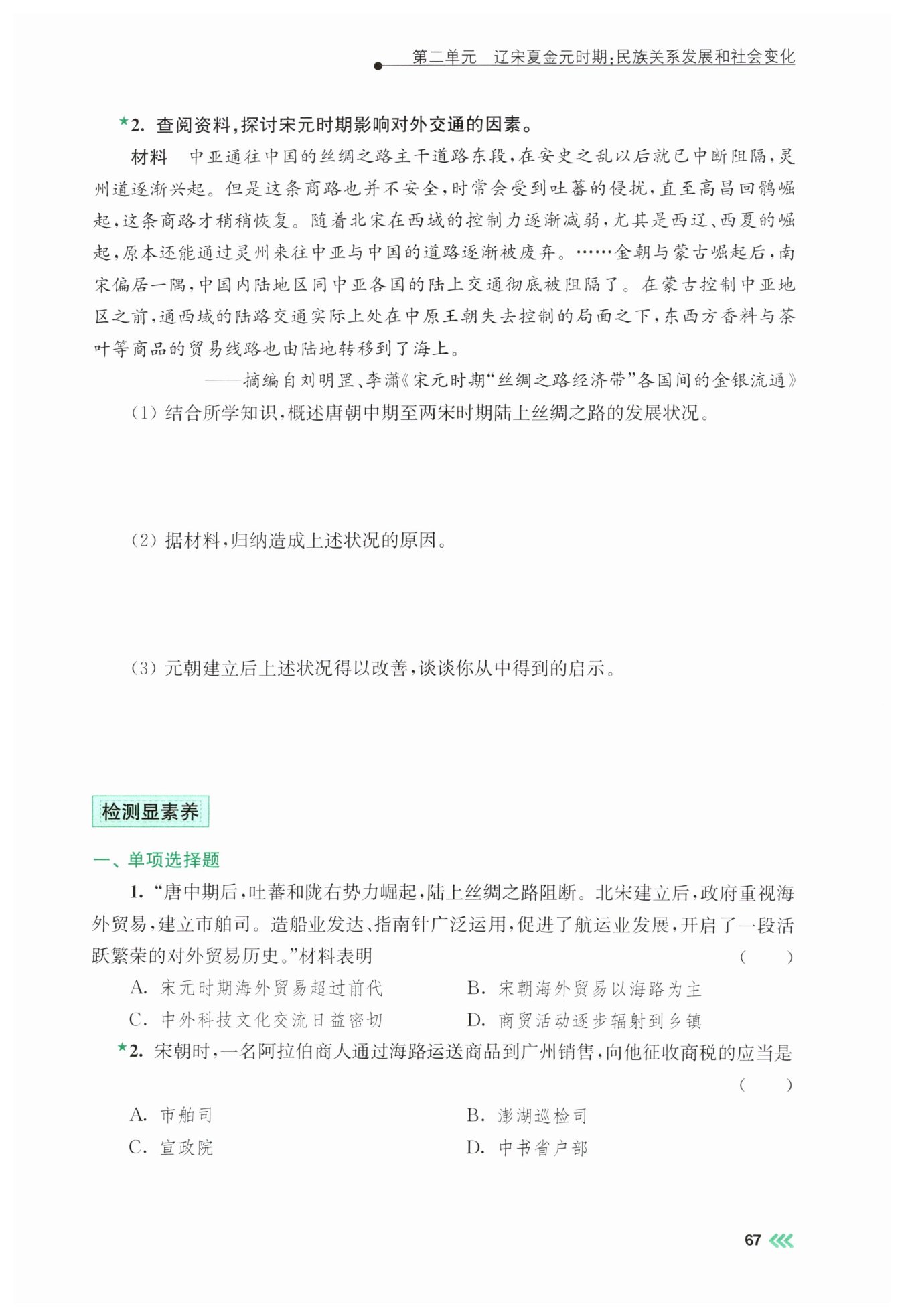 本题以宋元时期陆上丝绸之路的发展变化为载体,考查学生的材料信息提取、归纳能力及历史启示总结能力。解题需注重时间线梳理,结合材料与所学知识分析因果关系,培养史论结合的历史思维,同时引导学生认识国家统一对对外交流的重要意义。