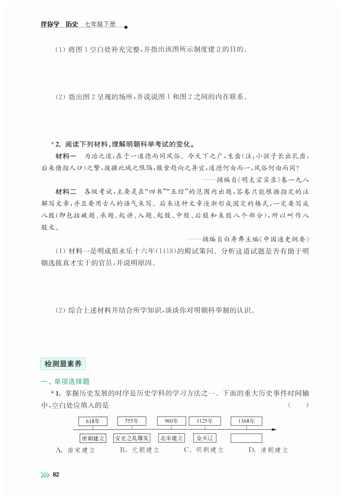 本题通过两则材料考查对明朝科举制发展变化的全面认识,要求学生结合材料信息辩证分析历史制度的影响,培养史料实证和历史解释能力,引导学生认识制度变革与社会发展的关联。