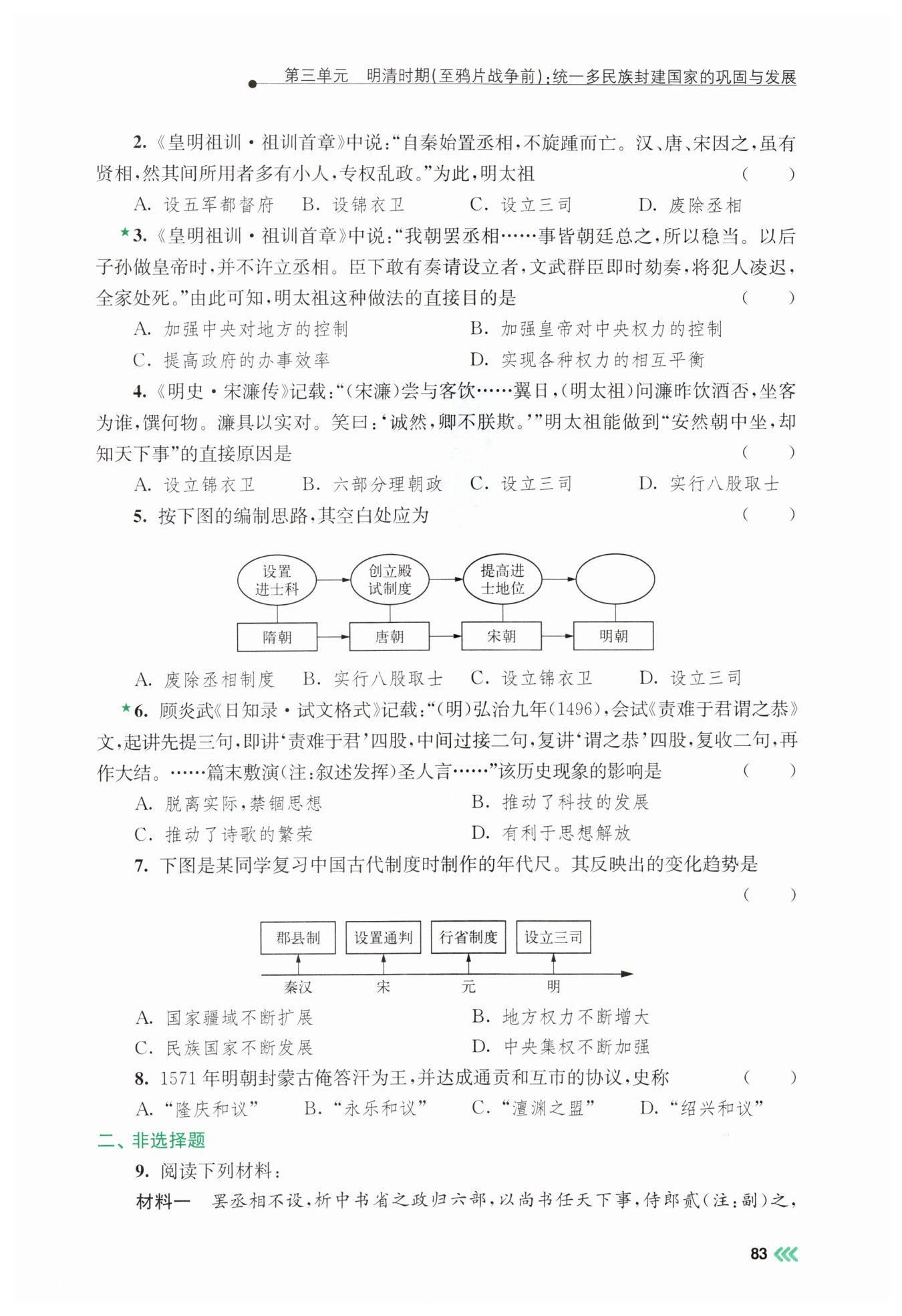 选项B:设锦衣卫是为了建立特务监察体系,监视臣民,不属于针对丞相制度的措施,排除;