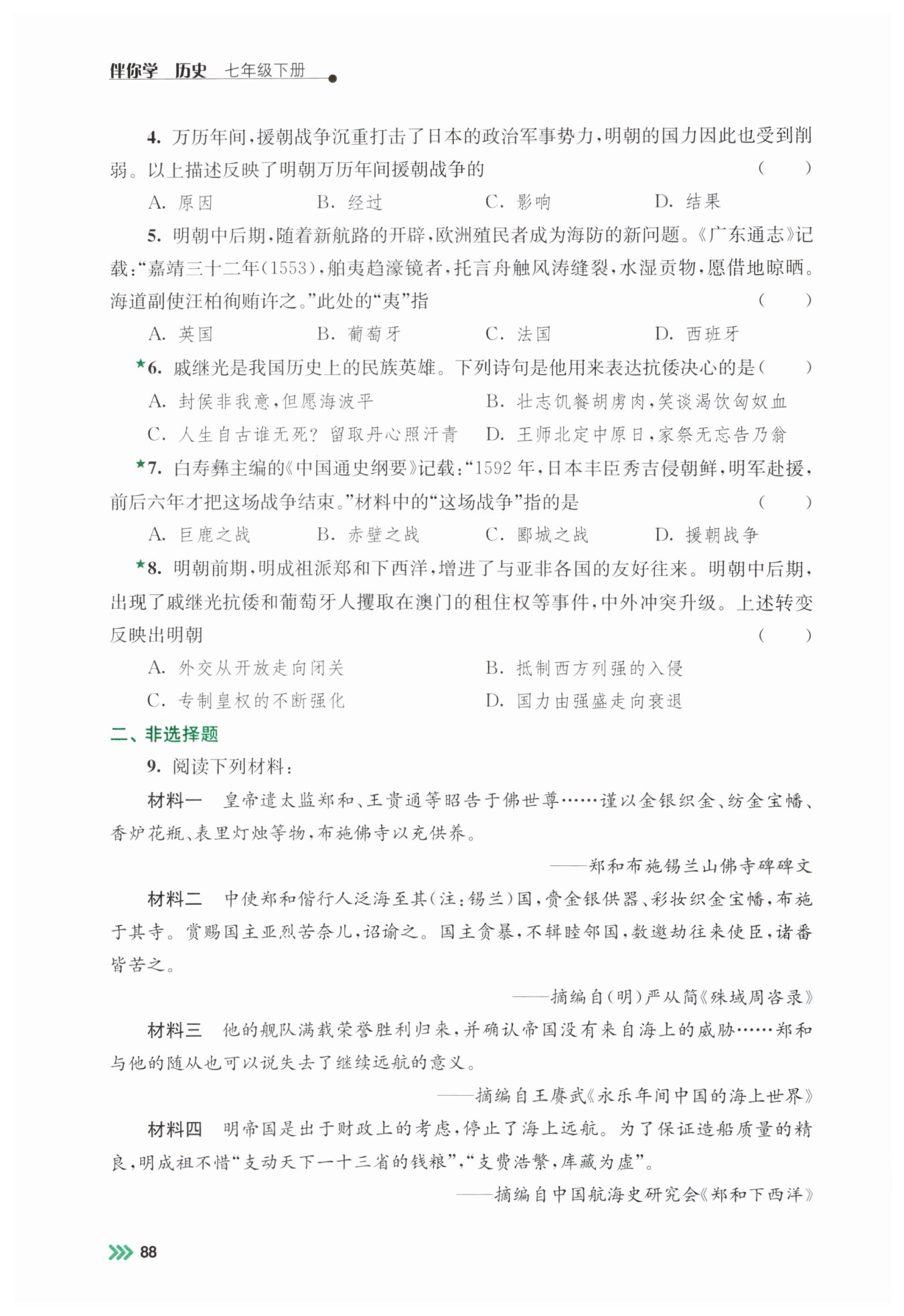 本题通过四则与郑和下西洋相关的史料,考查学生从史料中提取有效信息、印证分析历史问题的能力,有助于学生理解郑和下西洋的相关史实及明朝终止远洋航行的原因,培养史料实证的历史核心素养。