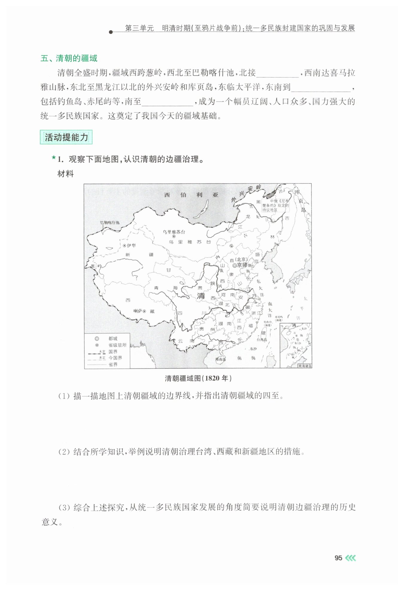 1. 第(1)问:先观察地图上的边界标识与方位标注,结合课本中清朝疆域的史实,从东西南北各个方位逐一梳理疆域的四至点,确保每个边界点与地图、史实对应准确。