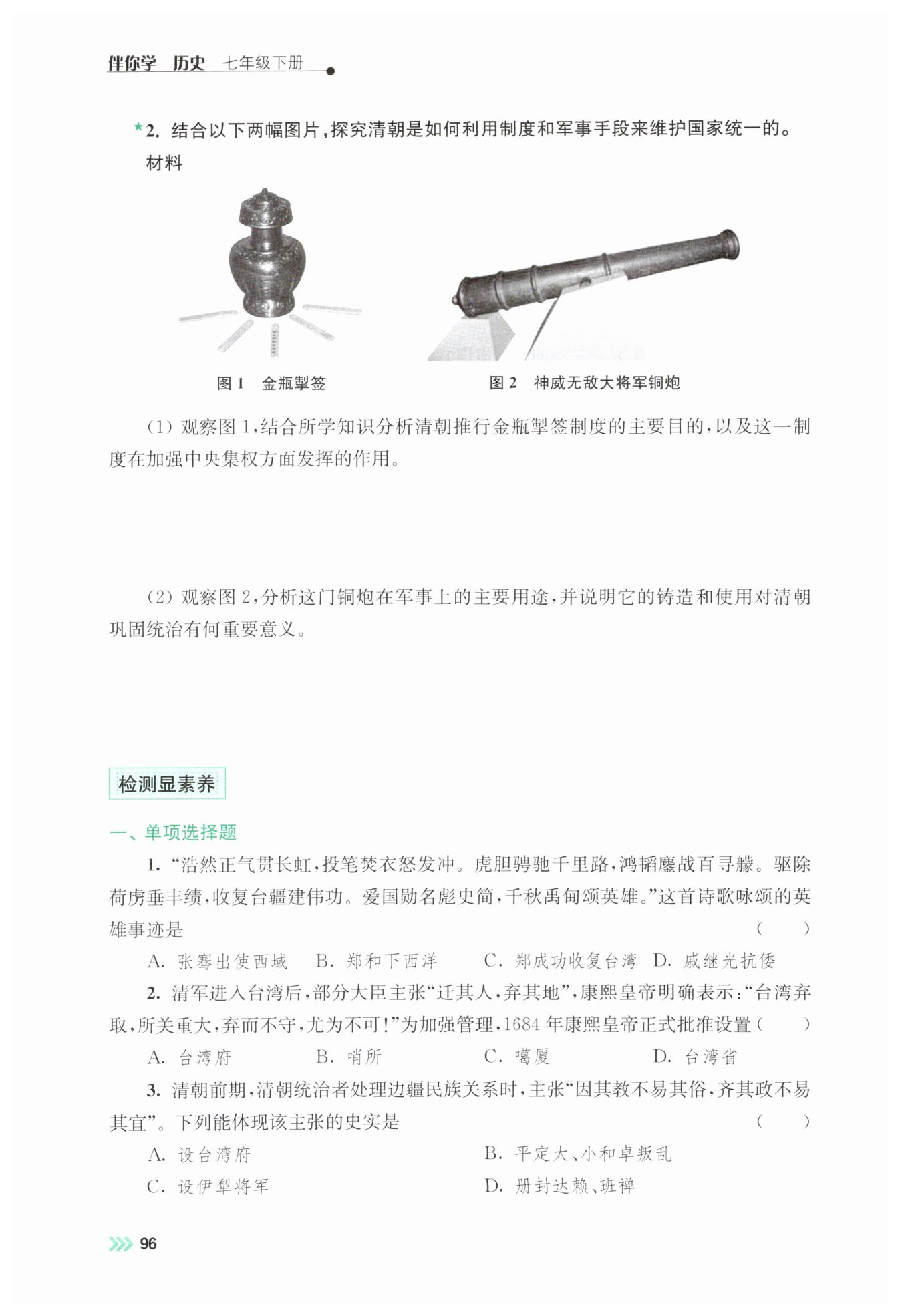 本题结合历史图片,从制度与军事两个角度考查清朝维护国家统一的举措,既要求学生扎实掌握清朝边疆治理的史实,也培养了学生分析史料、提炼核心要点的能力,帮助学生理解清朝维护国家统一的多元手段,树立正确的国家统一观念。