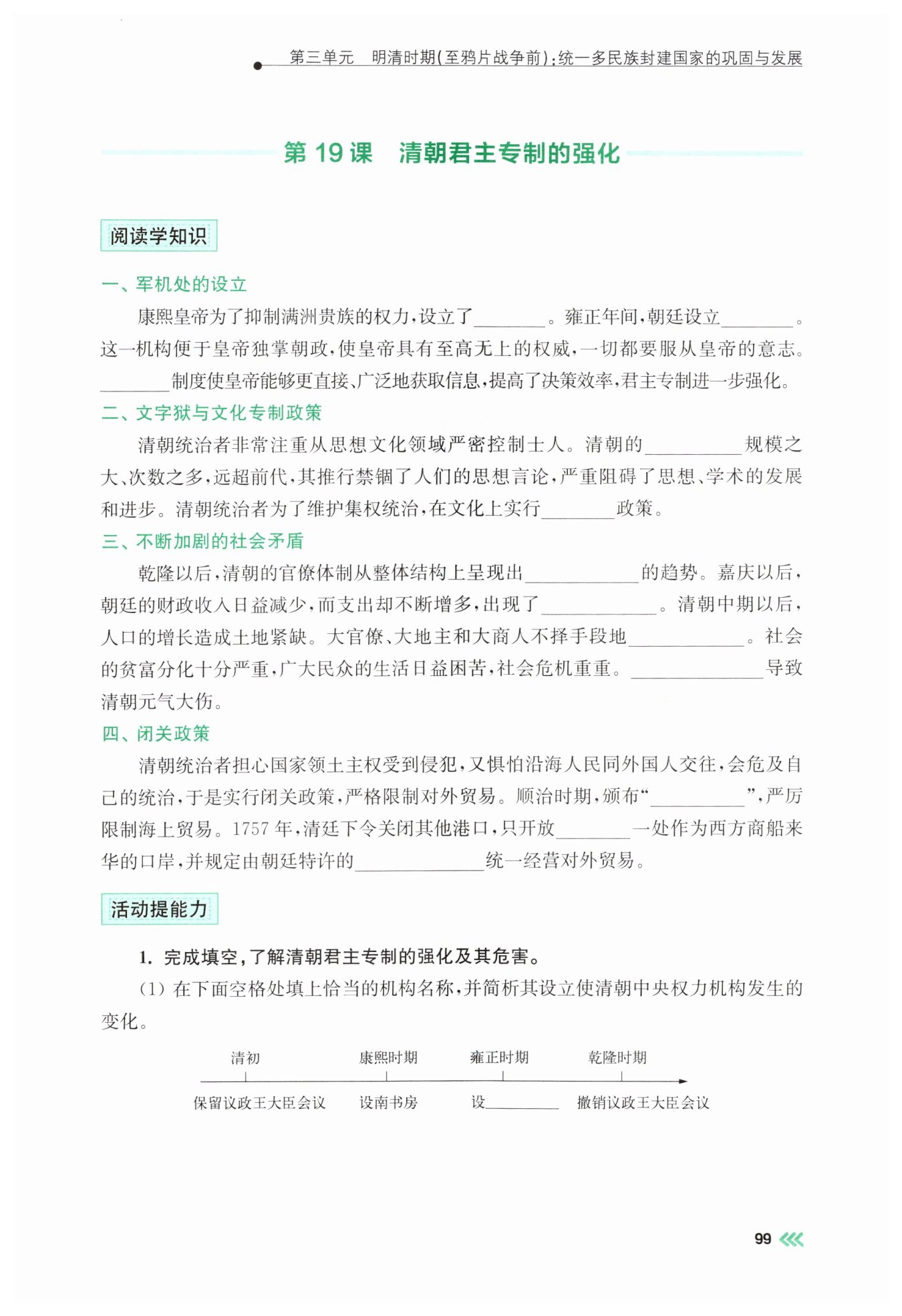 本题围绕清朝君主专制的强化展开,既考查清朝中央权力机构的演变史实,又注重考查君主专制强化带来的连锁社会问题,要求学生具备梳理历史脉络和分析因果逻辑的能力,帮助学生深刻理解君主专制制度的消极影响。