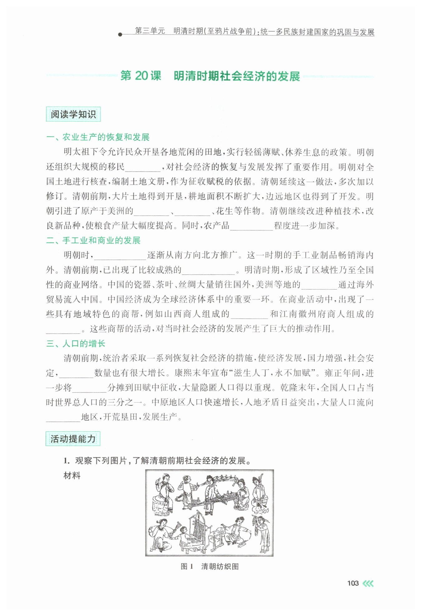 (1)观察图1可知,清朝纺织业的进步之处在于:出现了分工协作的手工工场,众多劳动者分工明确,每人仅负责一道工序,生产工序细致复杂,呈现出规模化生产的特征。