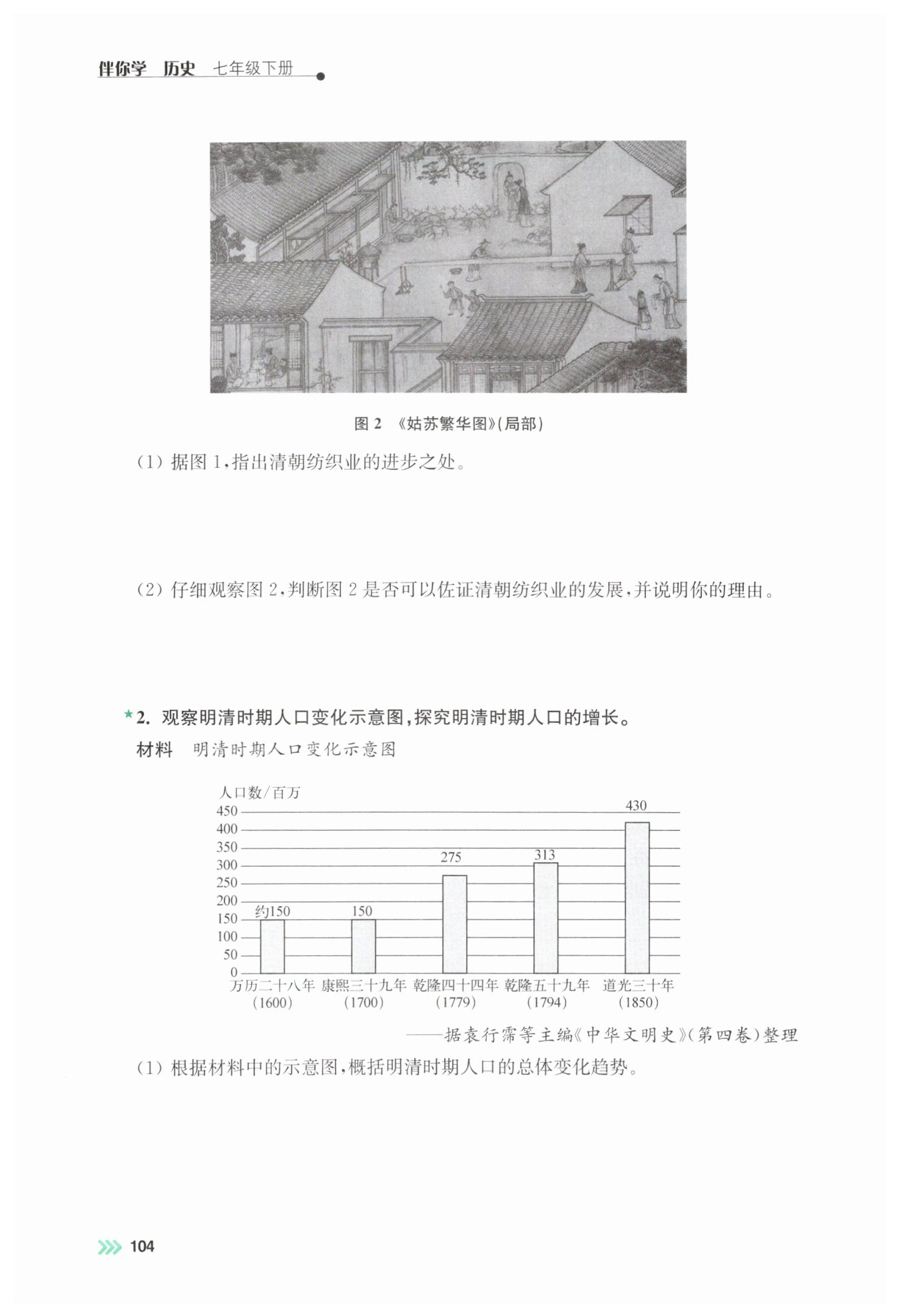 (1)观察示意图数据:万历二十八年(1600年)人口约150百万,康熙三十九年(1700年)为150百万,乾隆四十四年(1779年)达275百万,乾隆五十九年(1794年)增至313百万,道光三十年(1850年)攀升至430百万。可见从1600年到1850年,人口数量持续上升,因此明清时期人口总体呈持续增长趋势。